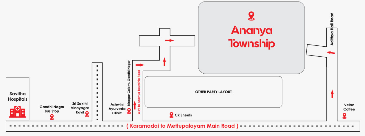 Ananya Township is a premium DTCP approved residential layout strategically located at Karamadai, Teachers Colony, on Mettupalayam Main Road. Developed by Rekha Realtors & Developers, this gated community project offers well-planned plots and ready-to-occupy 2BHK and 3BHK villas in a serene and rapidly developing corridor. With excellent connectivity just 400 meters from Mettupalayam Road Bus Stop and 4.4 km from Mettupalayam Railway Station, the project ensures both convenience and peaceful living. Surrounded by reputed schools, hospitals, temples, tourist destinations, and daily essentials, Ananya Township combines prime location with perfect serenity.